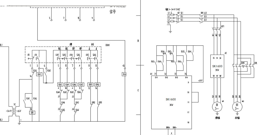 因此我們?cè)诒痉桨钢杏?jì)劃加兩個(gè)延時(shí)觸頭來(lái)穩(wěn)定保障抱閘的有效性。vfd的宏選擇交變宏。但考慮到葫蘆本身的抱閘較緊,以及在低速運(yùn)行頻率較低情況下會(huì)無(wú)法打開(kāi)抱閘。這個(gè)問(wèn)題我們可以通過(guò)調(diào)試SKI600提升頻率就可以快速解決。