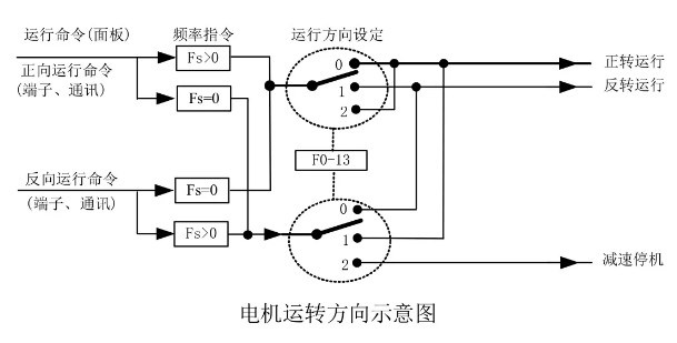在有的驅(qū)動系統(tǒng)中,只允許系統(tǒng)正轉(zhuǎn)運轉(zhuǎn)而不允許反轉(zhuǎn)運轉(zhuǎn),則需求將F0-13=2,此時若呈現(xiàn)反轉(zhuǎn)指令,則VFD將減速至0并進入停機狀態(tài),同時操作面上FWD/REV不斷閃爍。