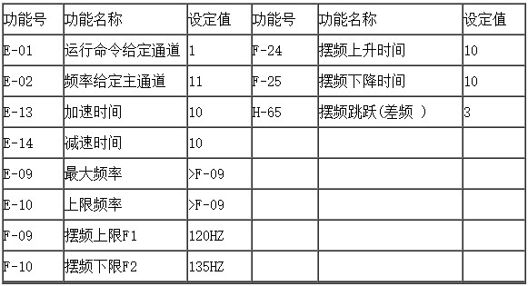 當(dāng)變頻器驅(qū)動(dòng)橫動(dòng)電機(jī)達(dá)到上限頻率f1或下限頻率f2時(shí),頻率應(yīng)突變,下降為或上升 ,突變頻率幅值一般為基本頻率F1 的1%左右,突變頻率的時(shí)間,理論上要求是0,但實(shí)際上,由于橫動(dòng)裝置和電機(jī)有慣性,使得電機(jī)速度不可能突變而有一過渡時(shí)間,過渡時(shí)間通常在0.1S以上。