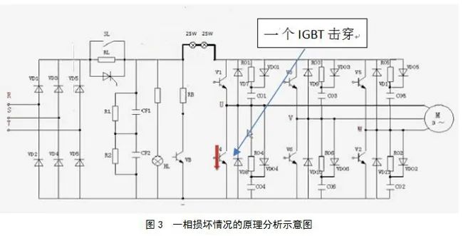 圖2為故障基本原理分析圖表,假定U相的2個(gè)IGBT都穿透了,等同于U相短路故障,這時(shí)一上燈泡即亮。