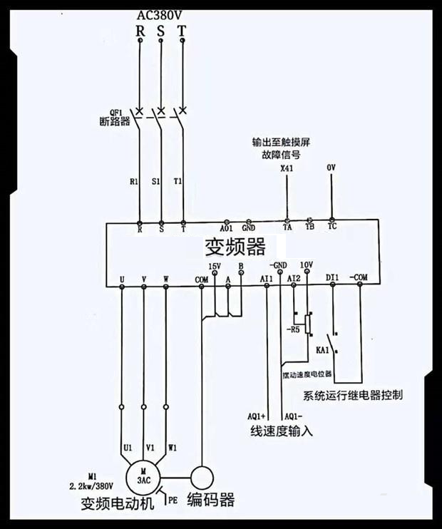上圖高性能矢量型變頻器的在實(shí)際電路中的應(yīng)用電路圖。上圖中變頻器所驅(qū)動的電動機(jī),在電動機(jī)軸上附加了一個(gè)編碼器來與電動機(jī)同步旋轉(zhuǎn),編碼器此時(shí)可以根據(jù)電機(jī)的速度隨時(shí)隨地采集它的動態(tài)速度的情況,及時(shí)反饋給變頻器的PG卡。