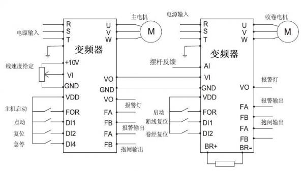 3、多組繼電器輸出。拉絲主機(jī)變頻器繼電器( FB.FC)為斷線故障報(bào)警輸出,繼電器(KA,KB)為系統(tǒng)減速停車(chē)時(shí)低頻抱閘輸出,實(shí)現(xiàn)卷取電機(jī)低速制動(dòng)。卷取電機(jī)變頻器繼電器( FB,F(xiàn)C)為斷線故障報(bào)警輸出,繼電器(KA,KB)為排線電機(jī)啟?;芈贰J箍刂凭€路設(shè)計(jì)簡(jiǎn)單方便,保證因發(fā)生異常導(dǎo)致的停車(chē)的運(yùn)行系統(tǒng)的安全性殛延續(xù)性。