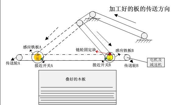 1.電機(jī)通過皮帶與減速器連接,減速器的輸出通過鏈輪與傳動(dòng)輪A、B連接,鏈輪與皮帶輪固定。鏈輪移動(dòng)時(shí),滑輪左右滑動(dòng),將傳送帶上的木板折疊起來;